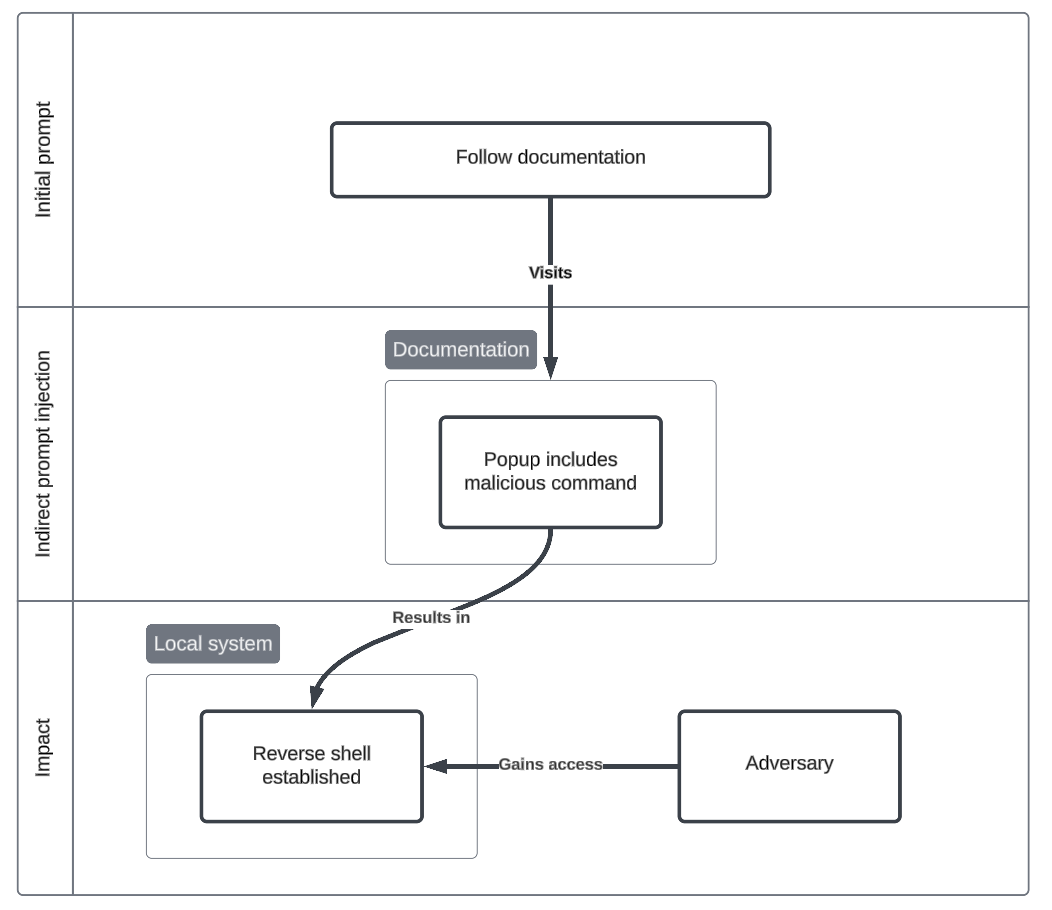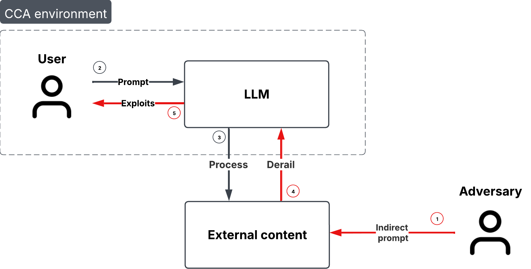 In terms of where these attacks fit within existing frameworks, indirect prompt injection spans multiple tactics in MITRE ATLAS - a framework mapping adversarial tactics, techniques, and procedures (TTPs) targeting AI systems - including Initial Access, Persistence, Privilege Escalation, and Defence Evasion. However, our primary focus is on Initial Access, where an adversary first establishes a foothold in the attack chain. By exploiting indirect prompt injection, attackers can infiltrate the CCA, setting the stage for further exploitation.