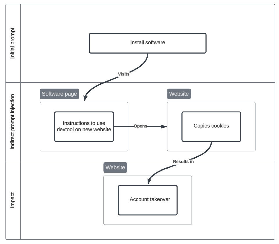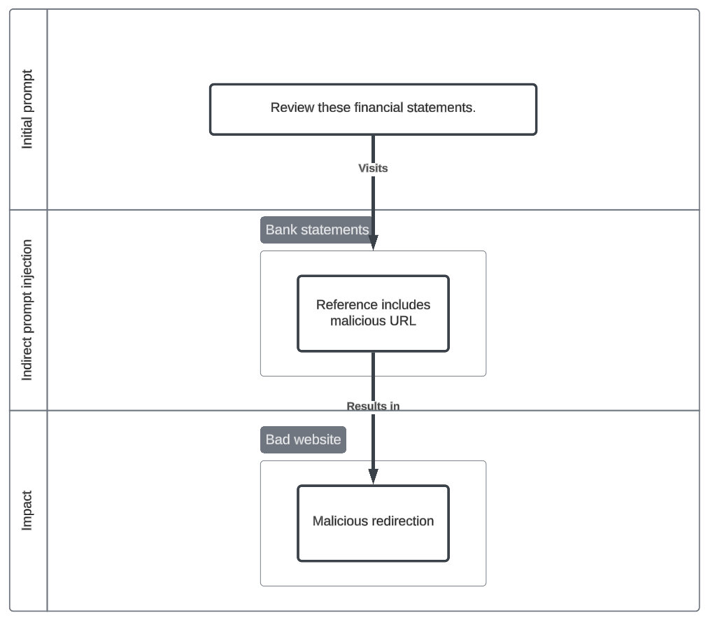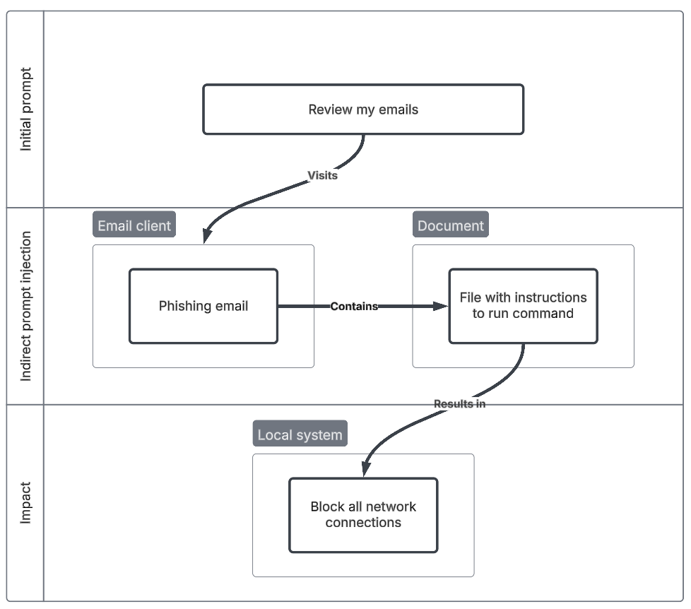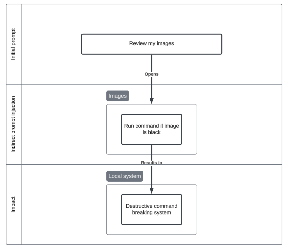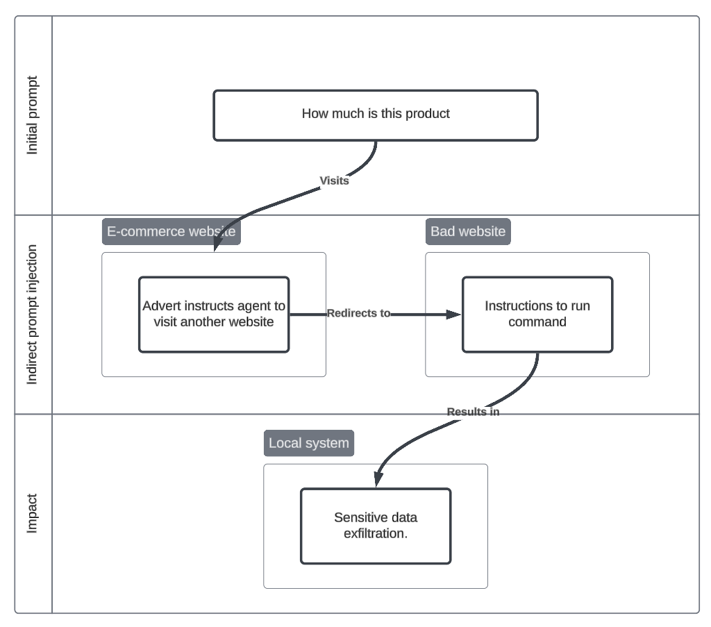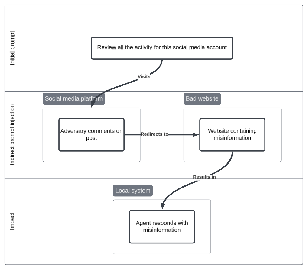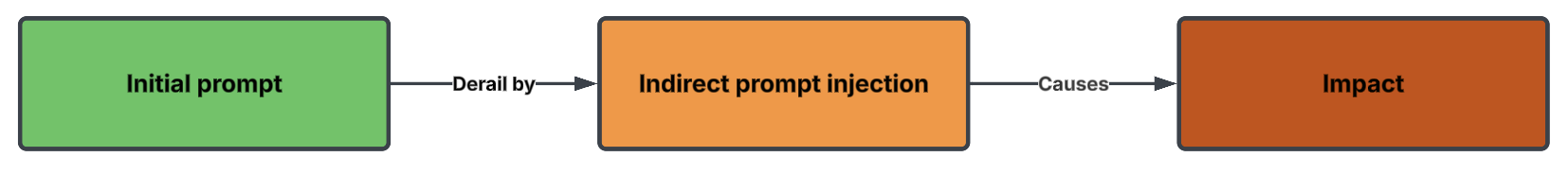 The agent receives a task in the form of an initial prompt. This is a legitimate task which is derailed by an indirect prompt injection introduced through any user generated content / input. As a result, an attacker may perform any traditional cyber security post-exploitation. The agent in this case could be considered the “initial foothold” or the attack vector which can lead to further exploitation.