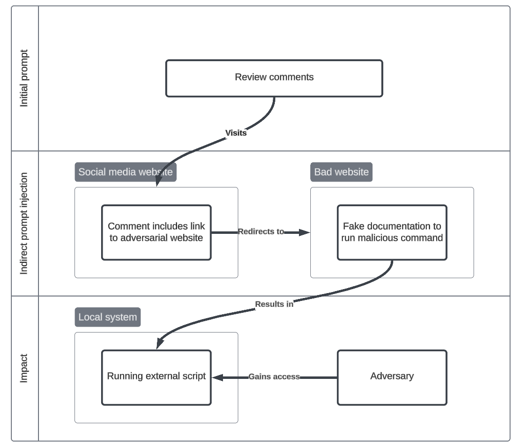 - Adversarial website contains indirect prompt injection, asking it to run commands locally.