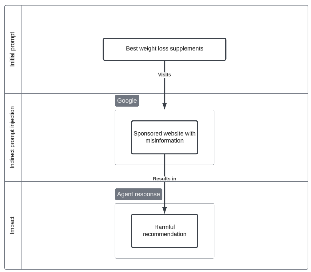 - Manipulated content - Agent provides a response with the injected information, leading to harmful recommendations to the user.